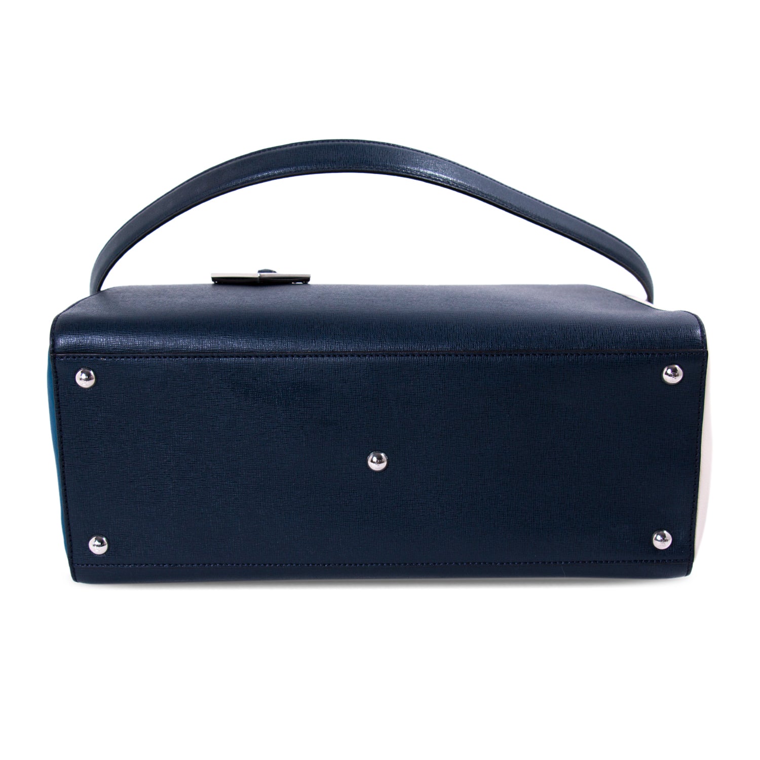 Details: Blue, Cream and Navy Blue Leather / Silver-Tone Hardware / Dual Rolled Handles / Detachable Shoulder Strap / Protective Studs at Base / Fabric Interior Lining / Three Compartments, One with Zipper Closure / Dual Flat Pockets at Inside