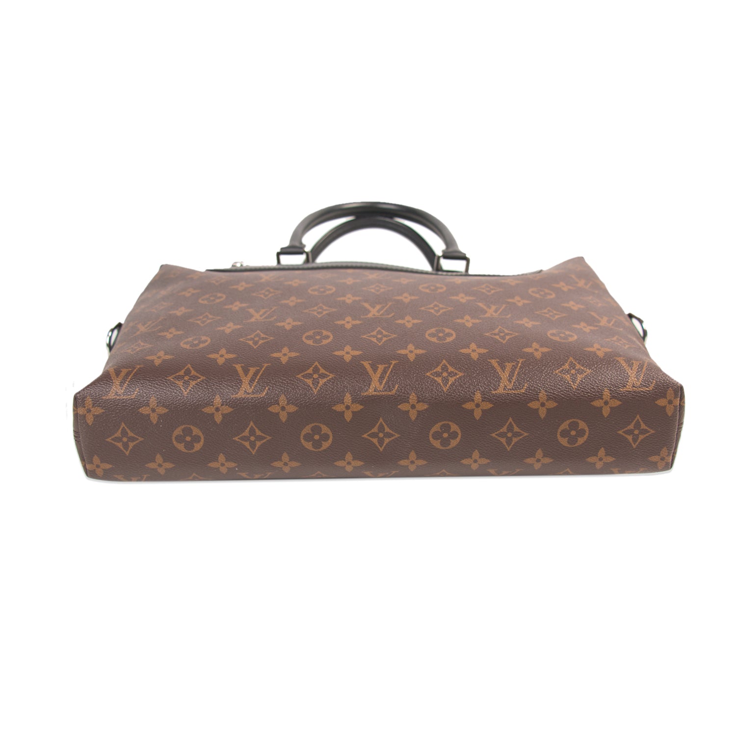 Details: Brown Monogram Macassar Coated Canvas / Silver-Tone Hardware / Black Leather Trim / Dual Rolled Handles / Detachable and Adjustable Shoulder Strap / Exterior Zip Pocket at Front / Burgundy Fabric Lining / 1 Compartment and 5 Interior Pockets / Zip Closure at Top