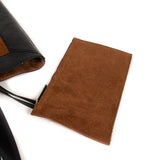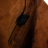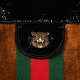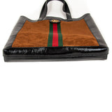 Details: Brown Suede / Red and Green Stripe / Black Patent Leather Trim / Brass Hardware / Dual Shoulder Strap / Brown Suede Lining / Open Top / Detachable Pouch