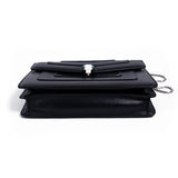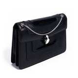 Details: Glazed, Soft and Patent Black Leather / Silver-Tone Hardware / Dual Snake Chain Shoulder Strap / Colored Serpenti Head Embellishment With Malachite Eye Accents / Logo Adornment At Exterior Back / Aubergine Woven Lining / Three Compartments At Interior One with Zip Closure / Dual Interior Wall pockets One With Zip Closure / Push Closure At Front Flap