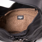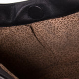 Details: Black Embossed Leather / Black-Metal Hardware / Braided Leather Drawstring / Panther Adornment at Front Face / Single Flat Handle / Tan and Brown Printed Suede at Interior / Two Flat Pockets and One Zip Pocket / Magnetic Snap Closure