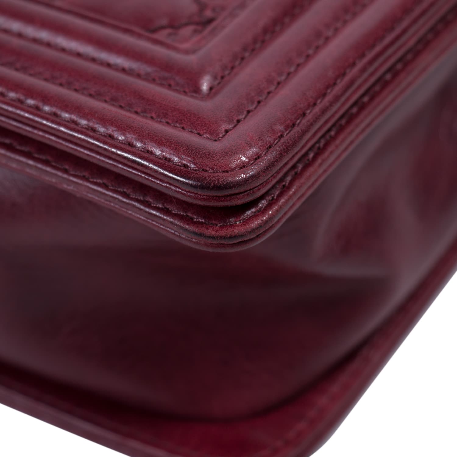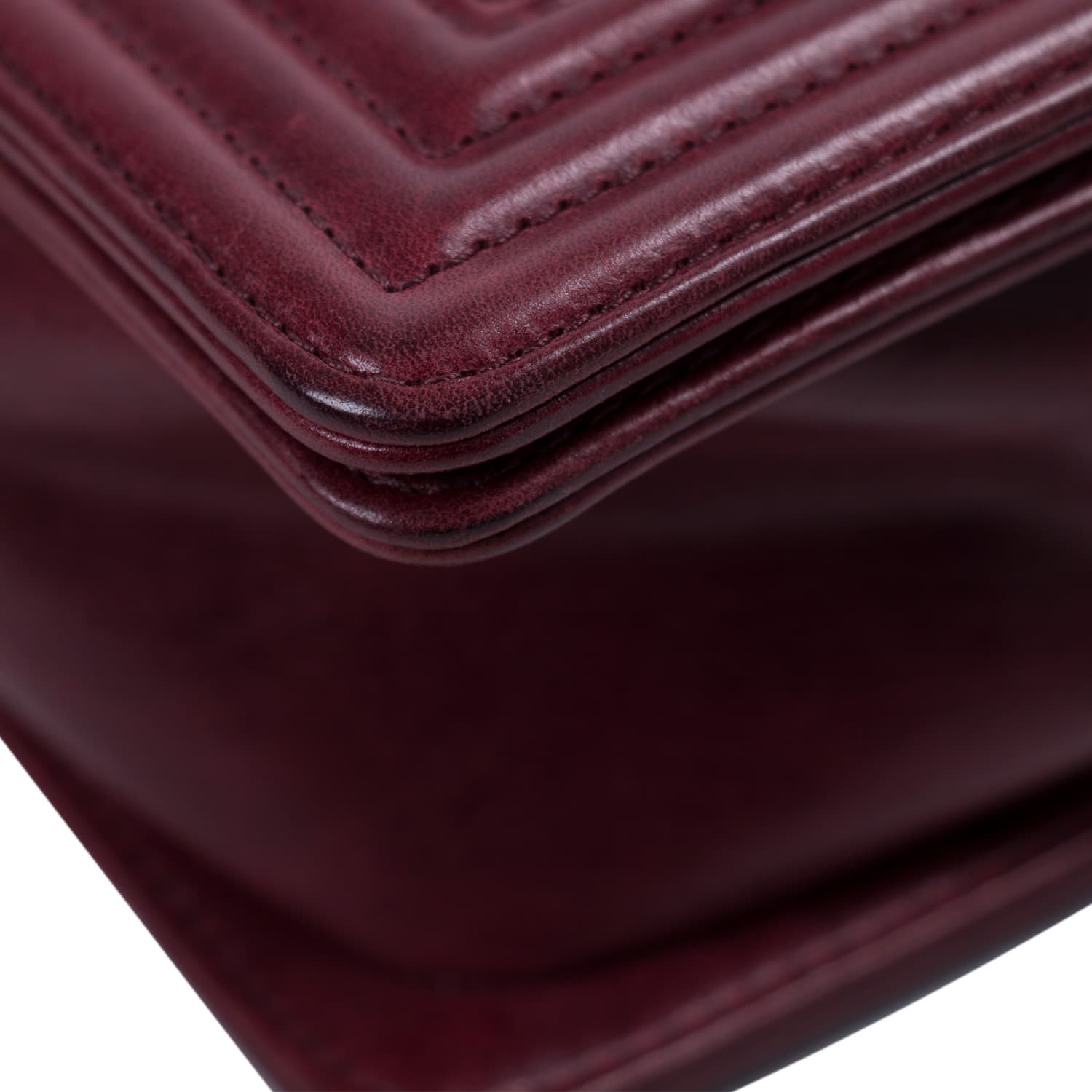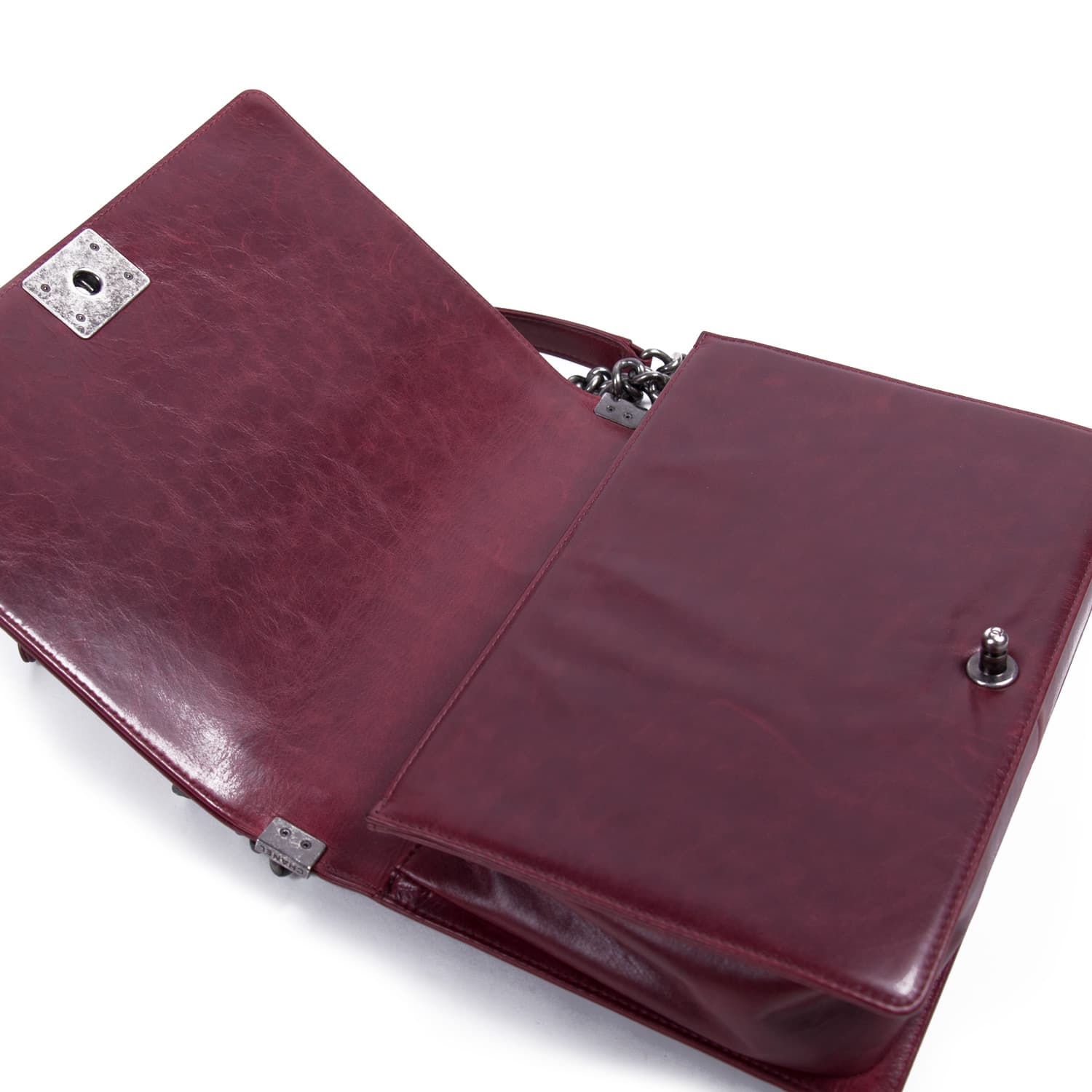 Description: Burgundy Lambskin Leather / Brushed Metal Hardware / Chain-Link and Leather Shoulder Strap / Single Compartment / Black Fabric Lining / Dual Flat and One Zipper Pocket at Inside / S-Lock Closure at Front Flap