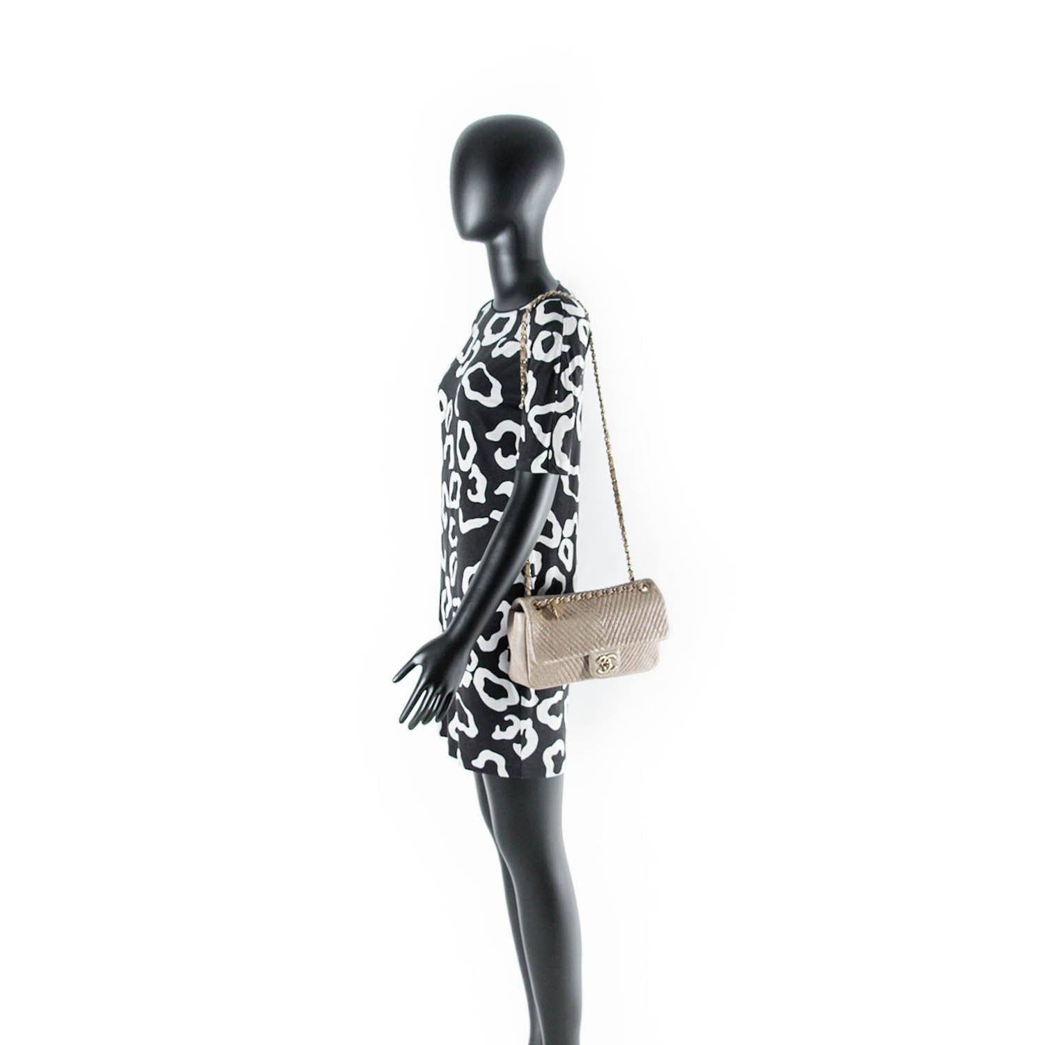 Description: Tan Chevron Quilted Leather / Gold-Tone Hardware / Chain-Link and Leather Shoulder Strap / Single Compartment / Black Fabric Lining / Single Slit Pocket at Inside / Turn-Lock Closure at Front Flap