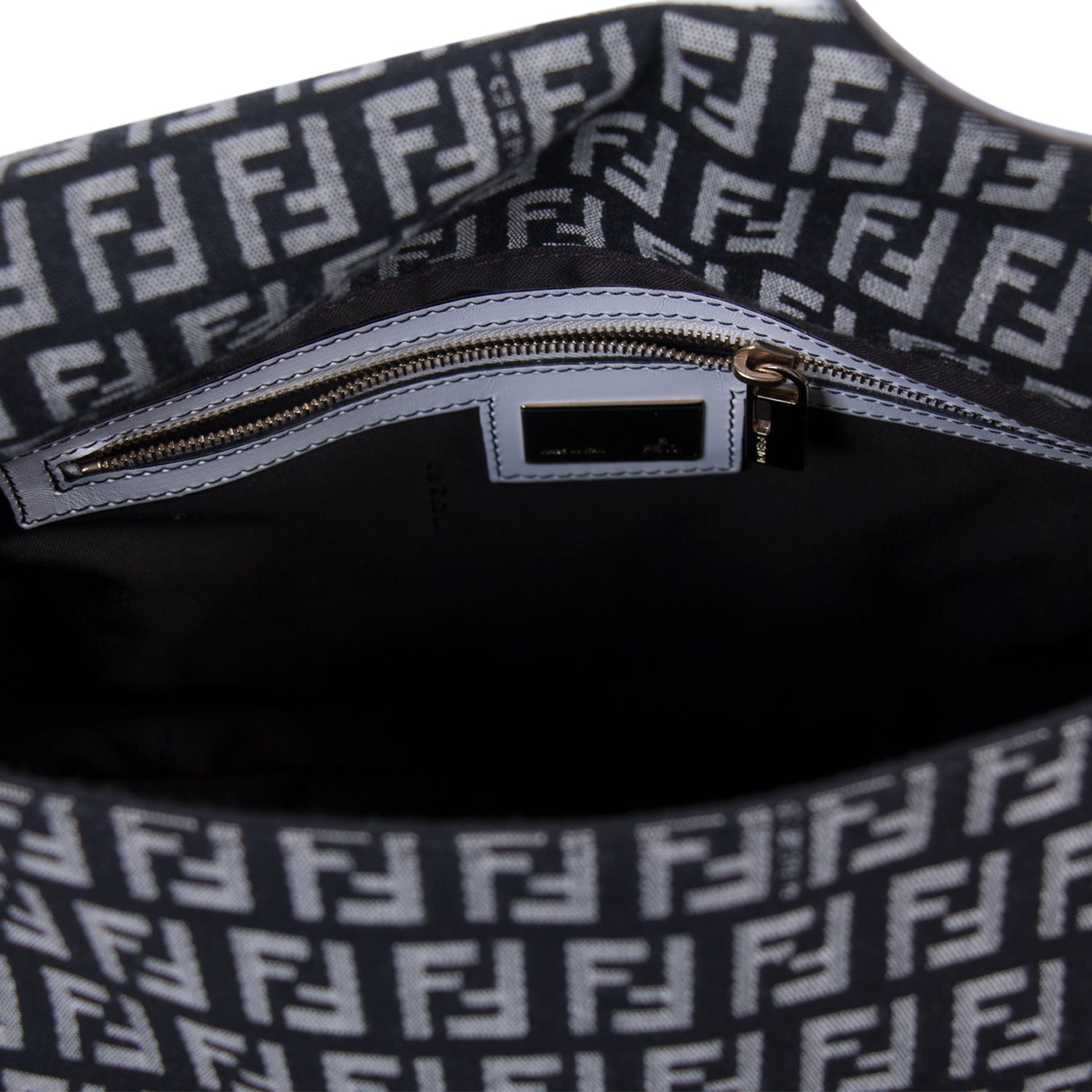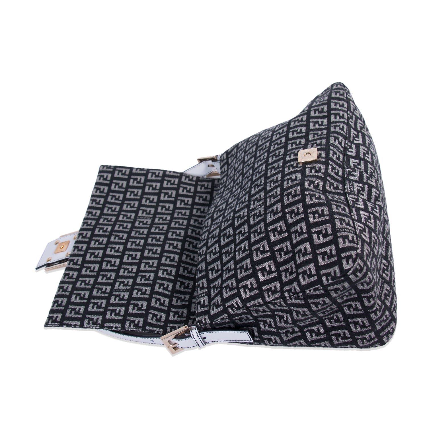 Details: Black and Grey Fendi Zucca Canvas / White Leather Trim / Gold-Tone Hardware / Logo at Front / Adjustable Shoulder Strap / Black Fabric Interior / Zipper Pocket at Inside / Magnetic Snap at Front Flap