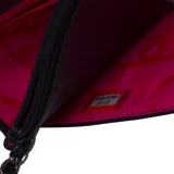 Details: Black Quilted Leather / Silver-Tone Hardware / Silver-Tone Hardware / Long Leather and Metal Chain / Printed Canvas Lining / Dual Flat Pockets and One Zipper Pocket / Six Card Slots / Push Button Closure at Front