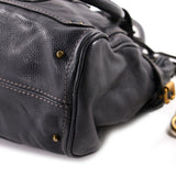 Details: Dark Grey Leather / Brushed Gold and Silver Hardware / Dual Large Shoulder Handles / Dual Exterior Slit Pockets / Buckle Expansions at Sides / Black Fabric Lining / Two Pockets at Inside, One With Zip Closure / Zip Closure at Top / Fold-Over Padlock Embellishment