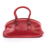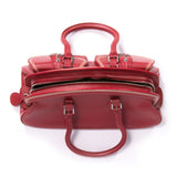 Details: Red Leather / Medium Size Handbag / Silver-Tone Hardware / Dual Pockets At Front With Snap Closures And "CD" Initials / Beige Printed Woven Interior Lining / Dual Pockets At Interior Walls One With Zip Closure / Zip Closure At Top / Studs At Base