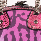 Details: Pink Leopard Print Canvas / Pink Python Skin / Silver Tone Hardware / Black Leather Trim / Dual Rolled Handles Covered In Python Skin / Two Metal Dices With Crystal Embellishments At Front / Canvas Print Interior Lining / Zip Pocket At Interior / Zip Closure At Top With Dice Chain Embellishment