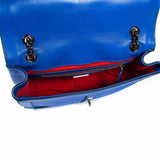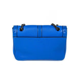 Details: Blue Leather / Black Hardware / Bow Embellishment at Front with Studs / Adjustable Chain Shoulder Strap / Flat Pocket at Back / Red Fabric Lining / Zipper and Flat Pockets at Inside / S Lock Closure at Top