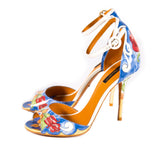 Details: Floral Prints Multicolor Patent Leather Sandals / Open Toe / Logo Embossed At Insole / Ankle Strap With Side Buckle Fastening / Printed Covered High Stiletto Heel