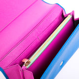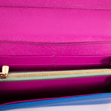 Details: Blue And Pink Grained Leather / Gold Tone Hardware / Detachable Chain Link Shoulder Strap / Yellow Leather Single Flat Top Handle / Gold Tone Logo Plate At Front / Pink Leather Interior Lining / Three Interior Compartments, One With Zip Closure / Twelve Card Slots / Two Flat Pockets, One Under The Front Flap / Foldover Top With Snap Closure