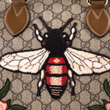 Details: Brown and Tan GG Coated Canvas / Gold-Tone Hardware / Dual Rolled Top Handles / Detachable Shoulder Strap / Large Bee and Flowers Embellishments at Front Face / Protective Studs at Base / Brown Suede at Interior / One Zip Pocket and Two Phone Pockets at Interior / Dual Zip Closure at Top