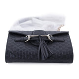 Details: Black Guccissima Leather / Gold Tone Hardware / Shoulder Strap with Chain Link Accent and Leather Pad / Natural Canvas Interior Lining / Single Slit Pocket at Interior Wall / Fold-in Flap Closure at Front / Horse-bit and Tassel Embellishments at Front