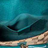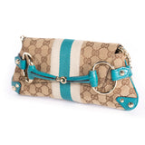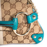 Details: Brown Monogram GG Canvas / Gold Tone Hardware / Turquoise Leather Accent And Trim / Detachable Chain-Link Shoulder Strap / Beige And Turquoise Gucci Web Panel / Horsebit Embellishment At Front Face / Turquoise Interior Lining / Single Slit Pocket At Interior / Fold-In Flap Closure At Front