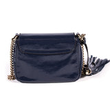 Details: Navy Blue Patent Leather / Gold-Tone Hardware / Single Shoulder Strap / Tassel Accent / Interlocking GG Logo Detail At Exterior Front / Beige Canvas Lining At Interior / Single Slit Pocket At Interior Wall / Magnetic Snap Closure At Front Flap