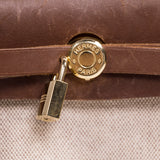 Details: Brown And Creme Interchangeable Canvas / Gold hardware / Tan Leather Trim / Brown And Tan Canvas Interior / Pull-Through Closure At Front / Inside Pocket / Dual Flat Top Handles
