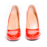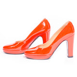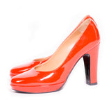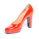 Details: Red Patent Leather / Round-Toe Pumps / Tonal Stitching Throughout / Covered Heels and Platforms /