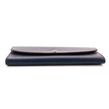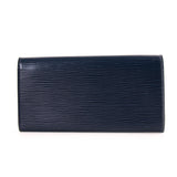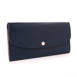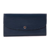 Details: Indigo Epi Leather / Silver Hardware / Beige Leather Lining / 4 Cards Slots / Single Zipped Coin Pocket / Dual 2 Flat Compartments / 1 Gusseted Compartment / Push Button Closure at Front Flap
