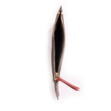 Details: Brown And Tan Monogram Coated Canvas Leather / Brass Hardware / Red leather Trim / Four Card Slots / Three Bill Compartments / Removable Zip Pouch / Red Snap Closure At Front