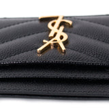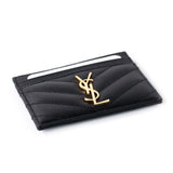 Details: Black Grained Leather / Gold Tone YSL Designer Logo Embellishment at Front Face / Dual Card Slots at Front and Back / Single Compartment in the Middle