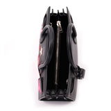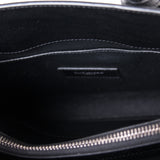 Details: Black Calf Leather / Silver-Tone Hardware / Dual Rolled Handles / Detachable Adjustable Shoulder Strap / Buckle-Fastening Sides For Adjustable Width / Protective Studs at Base / Black Fabric Interior Lining / Two Open Compartments and One Zipped Compartment / Single Internal Slot Pocket