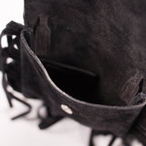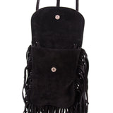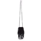 Details: Black Suede With Fringes / Silver Tone Hardware / Single Narrow Shoulder Strap / Fringes At Exterior / Logo Charm Accent At Front / Interior Suede Lining / Single Pocket / Magnetic Snap Closure At Front Flap