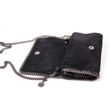 Details: Black Vegan Suede / Silver-Tone Hardware / Single Chain-Link Shoulder Strap / Pink Printed Woven Lining / Single Interior Slit Pocket / Magnetic Snap Closure At Front Flap