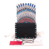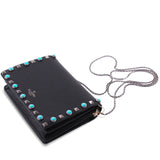 Details: Black Calf Leather / Metal Hardware / Long Chain Shoulder Strap / Blue Pearl Stud Embellishments Throughout the Front and Back / Leather and Suede Interior Lining / 3 Card Slots / One Zip Pocket / Snap Closure at Front Flap