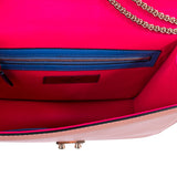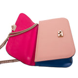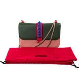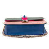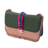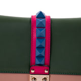 Details: Green and Nude Calfskin Leather / Gold-Tone Hardware / Long Chain Shoulder Strap / Exterior Pocket at Back / Blue Studs Embellishments at Front and Top / Fuchsia Leather Interior Lining / Three Pockets at Inside, One with Zipper / S-Lock Closure at Front Flap