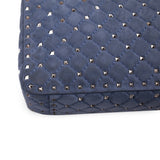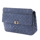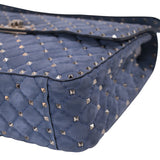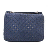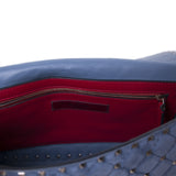 Details: Blue Slate Suede / Gold-Tone Hardware / Rockstud Spikes Throughout / Single Flat Handle / Detachable Shoulder Strap / Blue and Red Leather Interior Lining / Three Pockets at Inside one with Zipper / Turn-Lock Closure at Front Flap