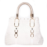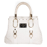 Details: White Quilted Leather / Gold-Tone Hardware / Dual Leather Rolled Handles / Gunmetal Studded Details Throughout / Interior Beige Satin Lining / Three Compartment, One With Zip Closure / Zip Pocket At Wall / Dual Flat Pockets At Interior Wal / Magnetic Snap Closure At Top