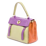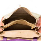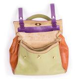 Details: Green, Brown, and Purple Leather / Gold-Tone Hardware / Pocket at Back with Button Closure / Beige Woven Interior Lining / Three Interior Compartments / Zip Closure / Push-Lock Closure at Front Face