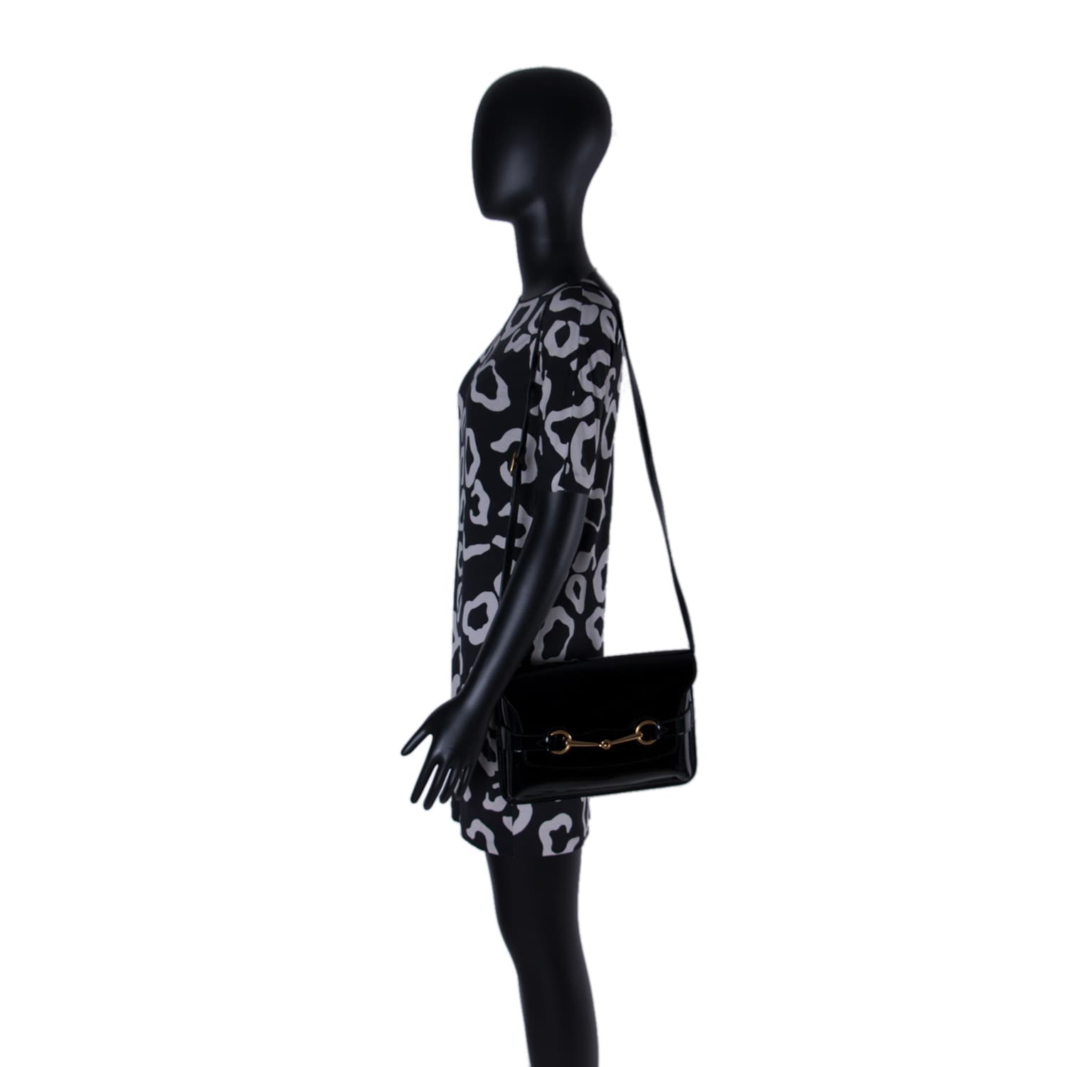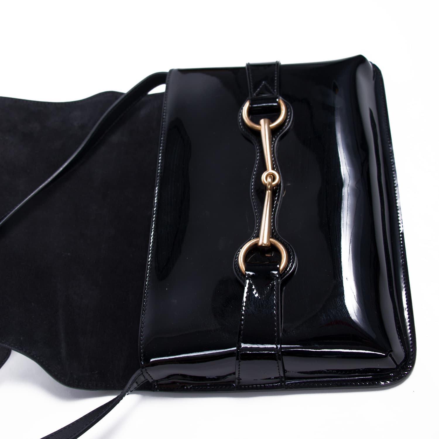 Details: Black Patent Leather / Gold-Tone Hardware / Adjustable Shoulder Strap / Small Zipper Pocket at Front / Natural Canvas Interior Lining / One Compartment / Three Flat Pockets and Zipper Pocket at Inside / Flap Closure