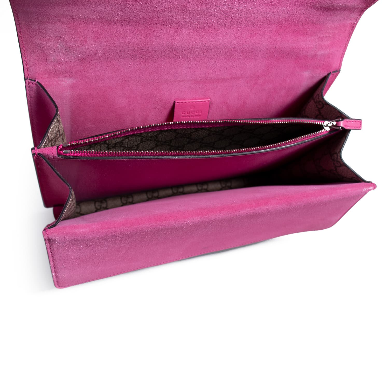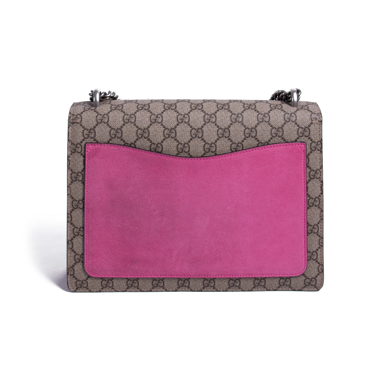 Details: Grey GG Coated Canvas / Patchwork Embroidery Throughout / Silver-Tone Hardware / Pink Suede Accent / Dual Chain Link / Exterior Pocket at Back / Pocket at Underside Flap / Suede Interior / Three Compartments, One with Zip Closure / Push-Lock Closure at Front Flap / Two-Headed Tiger Adornment