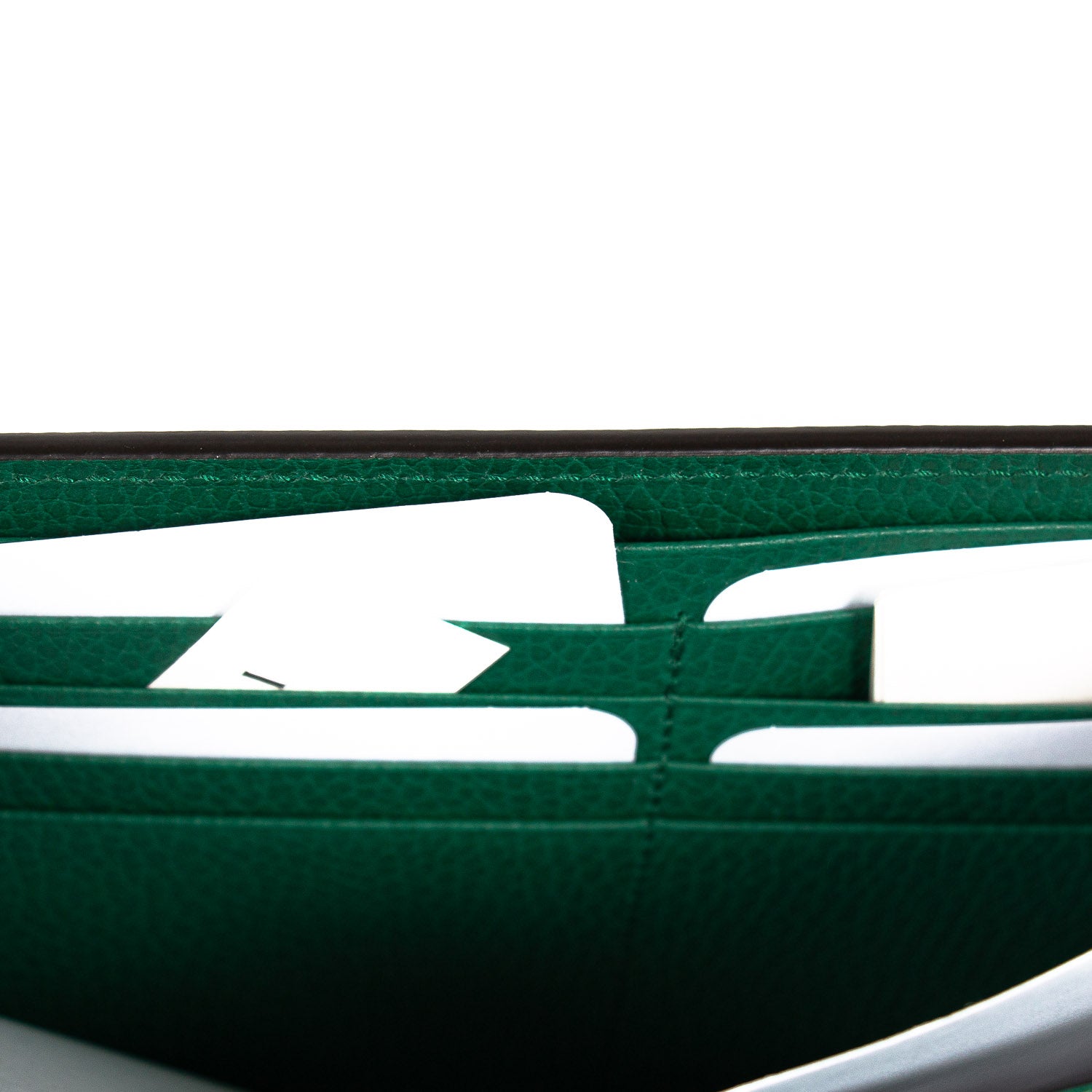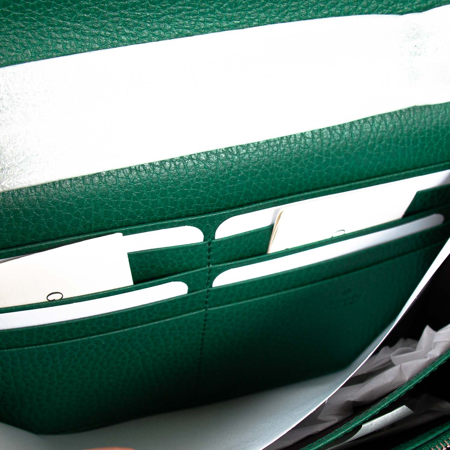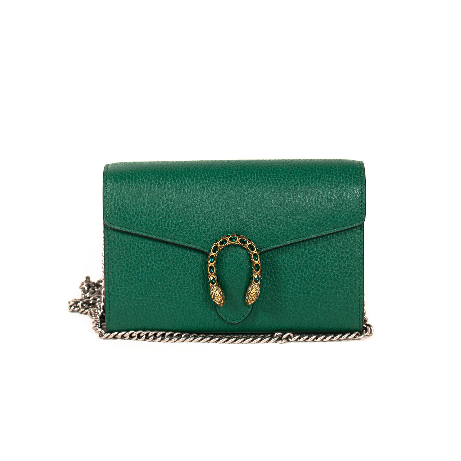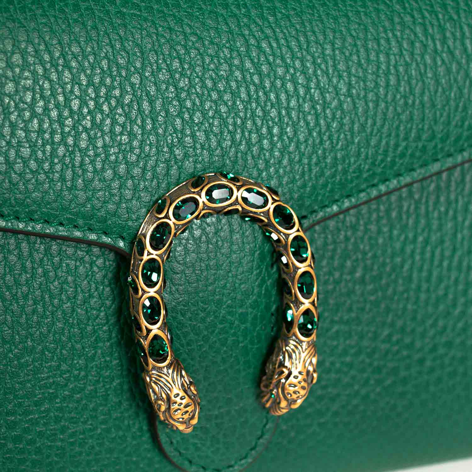 Details: Green Structured Leather / Antique Hardware / Crystal Embellishment at Tiger Head Front  / Detachable Chain Strap / Fabric Lining / 16 Card Slots / 2 Bill Compartments / Three Interior Compartments / Zip Coin Pocket / Snap Closure