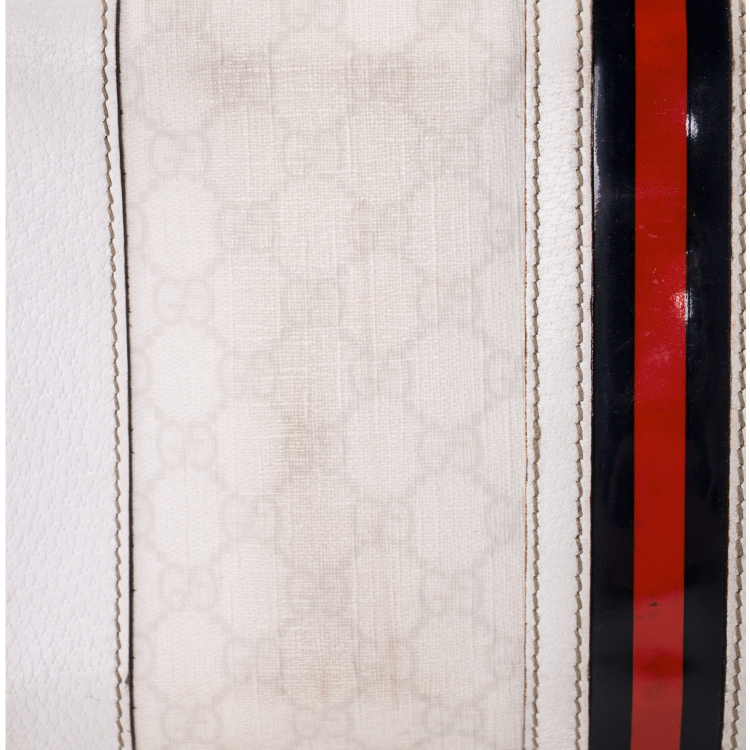 Details: White GG Leather / Gold-Tone Hardware / Dual Rolled Handles / Protective Studs at base / Zip Closure at Top / Navy Blue Nylon Lining / Zip Pocket at Interior / Red and Blue Web Stipe at Exterior / Push Lock Closure