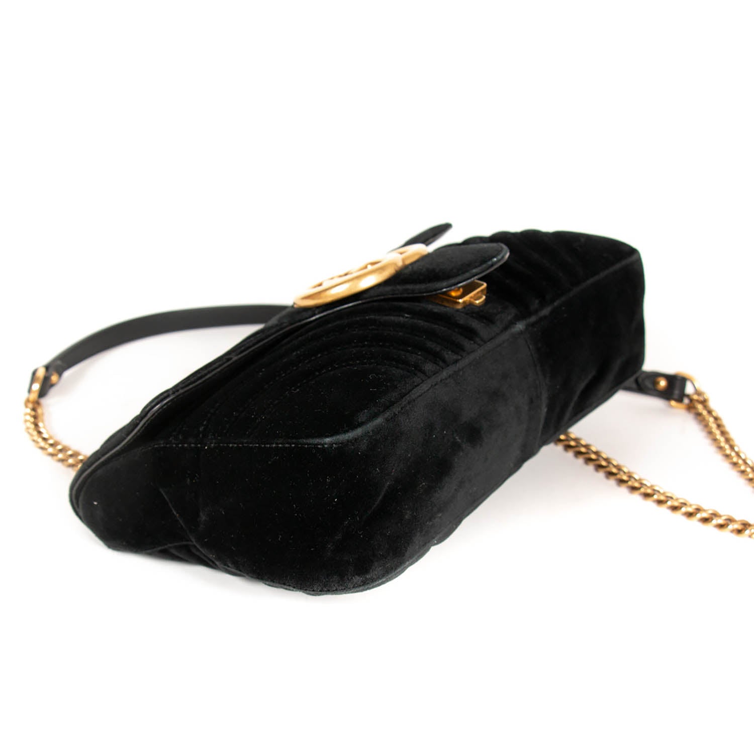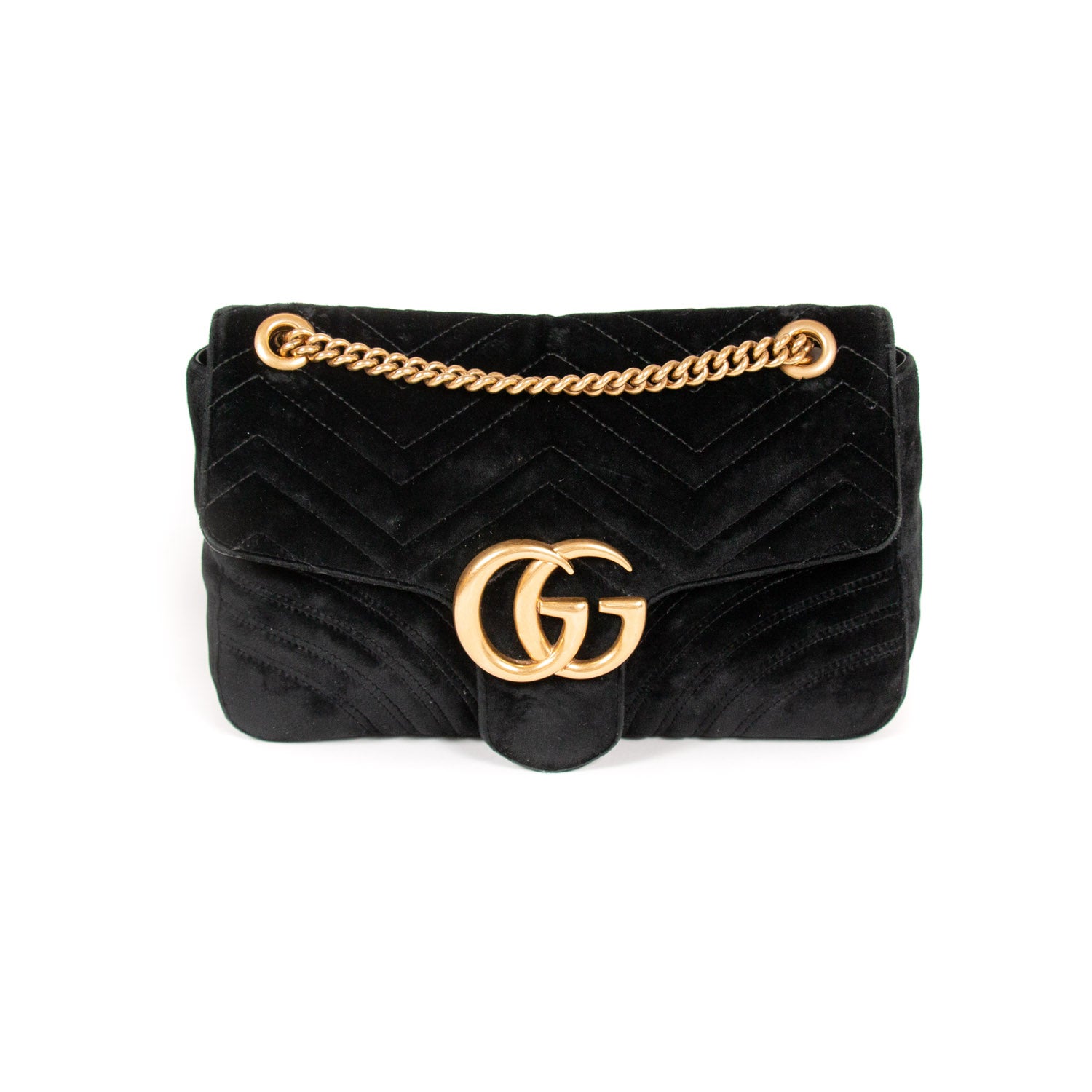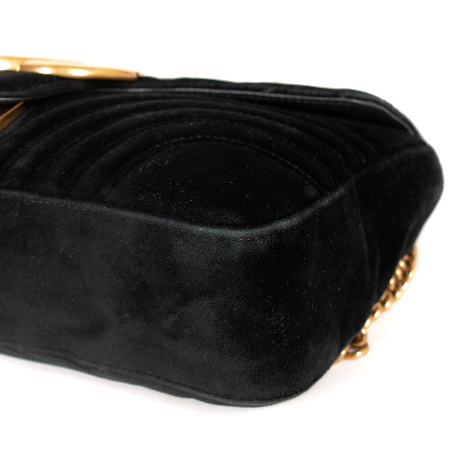 Details: Black Quilted Chevron Velvet / Gold-Tone Hardware / Chain-Link and Leather Pad Shoulder Strap / Double G Logo at Front / Satin Interior Lining / Zipper Pocket at Inside / Push Button Flap Closure at Top
