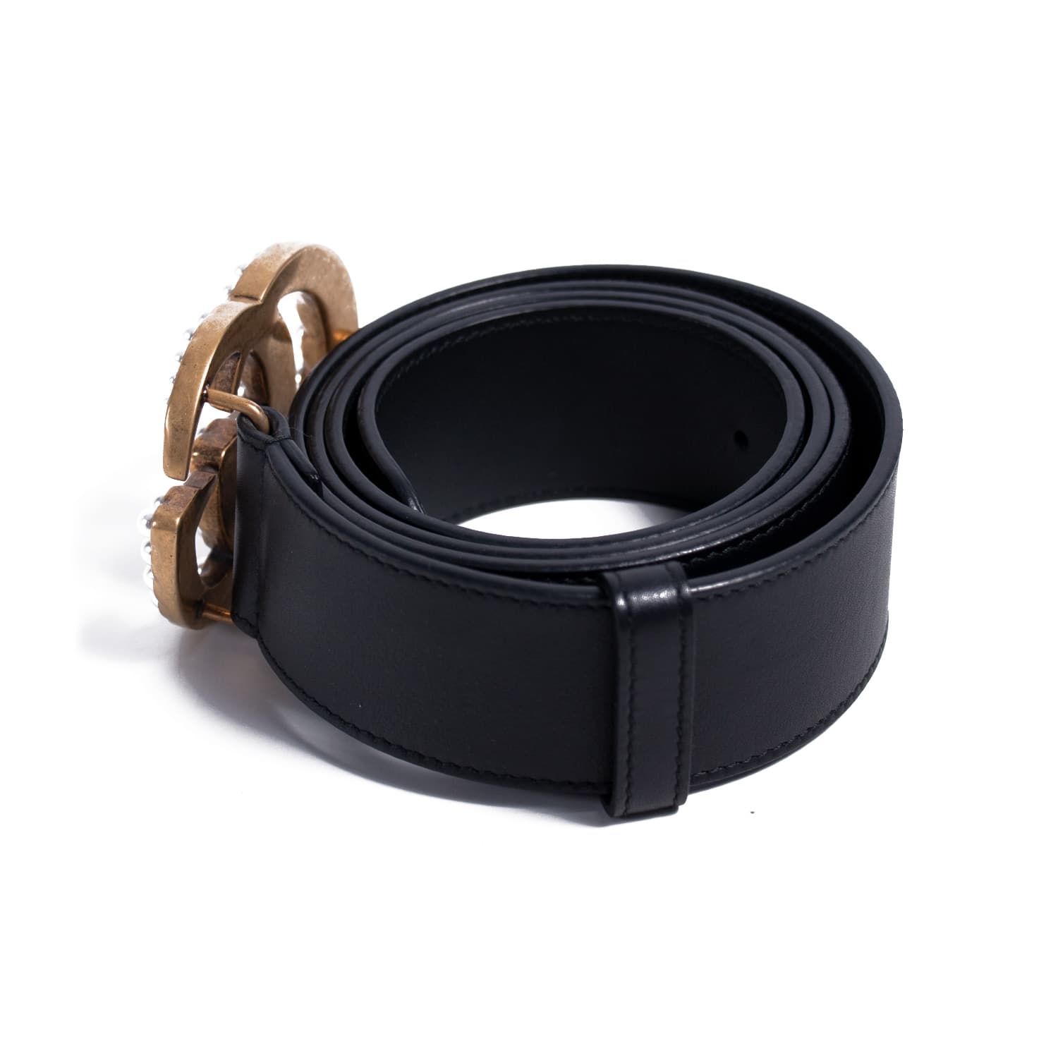 Details: Black Leather / Gold-Tone Buckle with Pearls Embellishment / Peg-In Holes