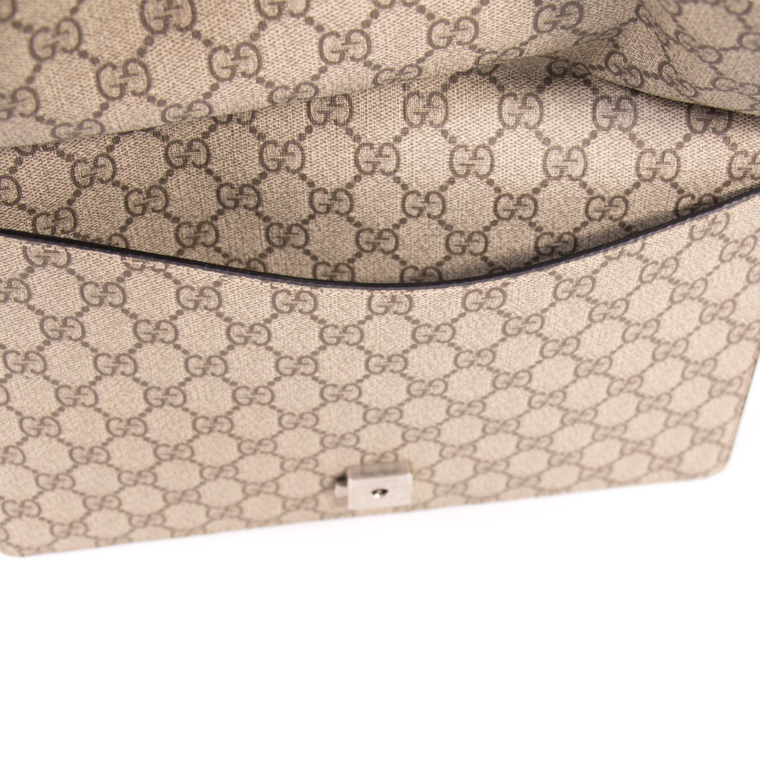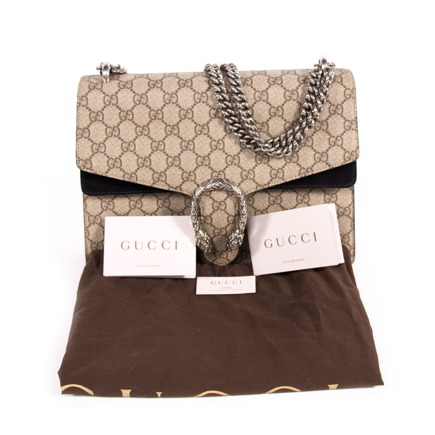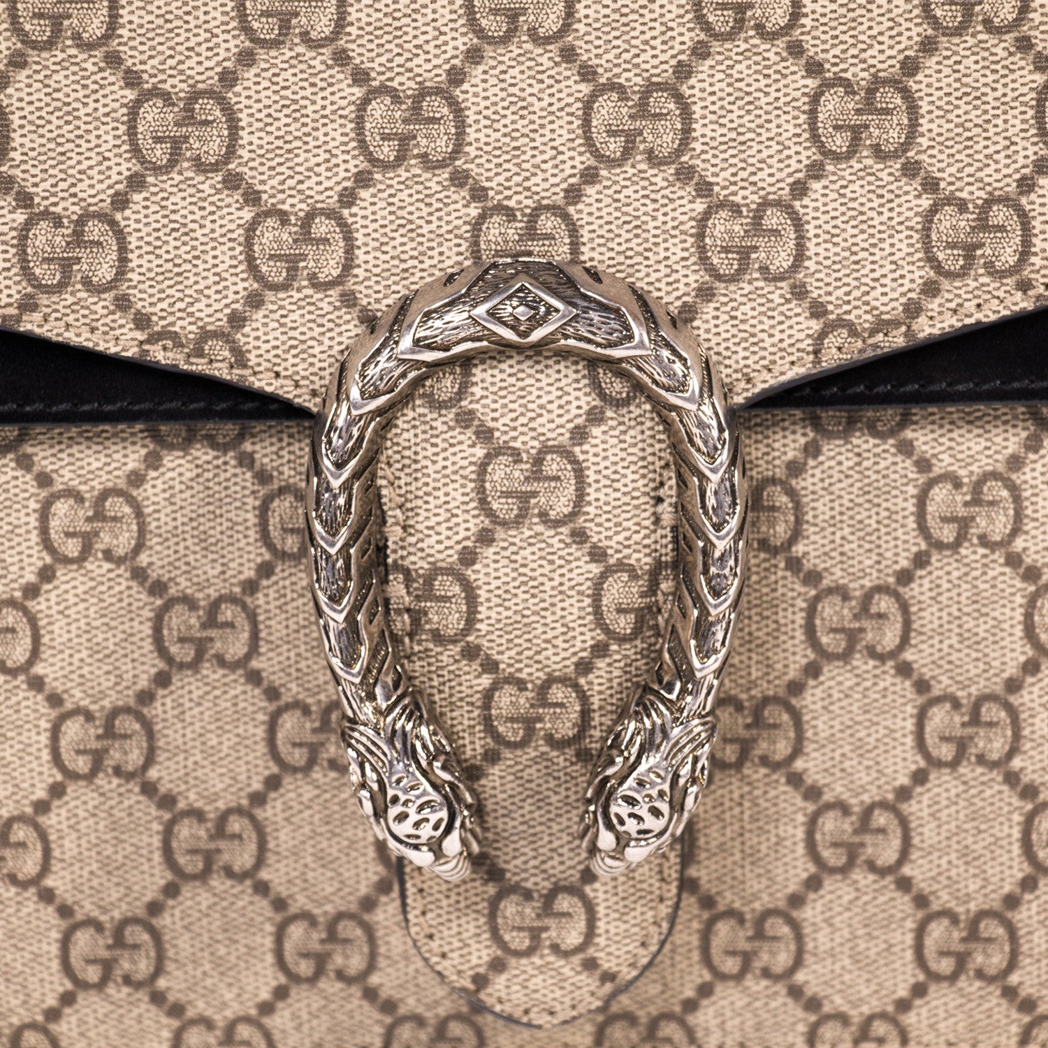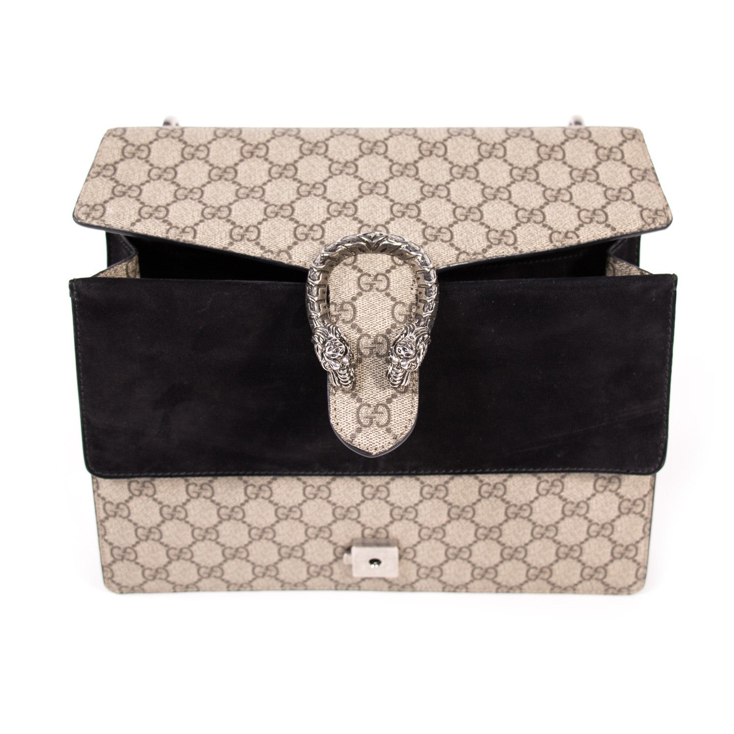 Details: Grey And Brown GG Coated Canvas / Silver-Tone Metal Hardware / Black Suede Accent At Front And Back / Dual Chain Link Shoulder Strap / Flat Exterior Pocket At Back / Single Pocket At Front Flap Underside / Black Suede And Canvas Interior / Three Compartments, One With Zip Closure / Push-Lock Closure At Front Flap / Two-Headed Tiger Adornment