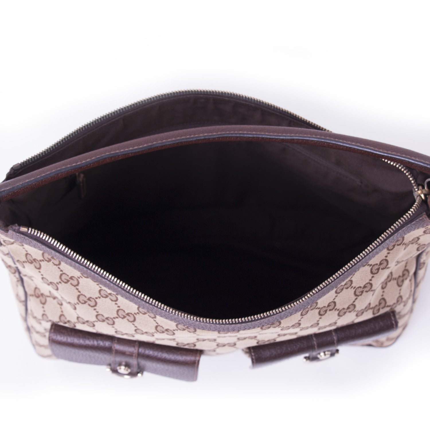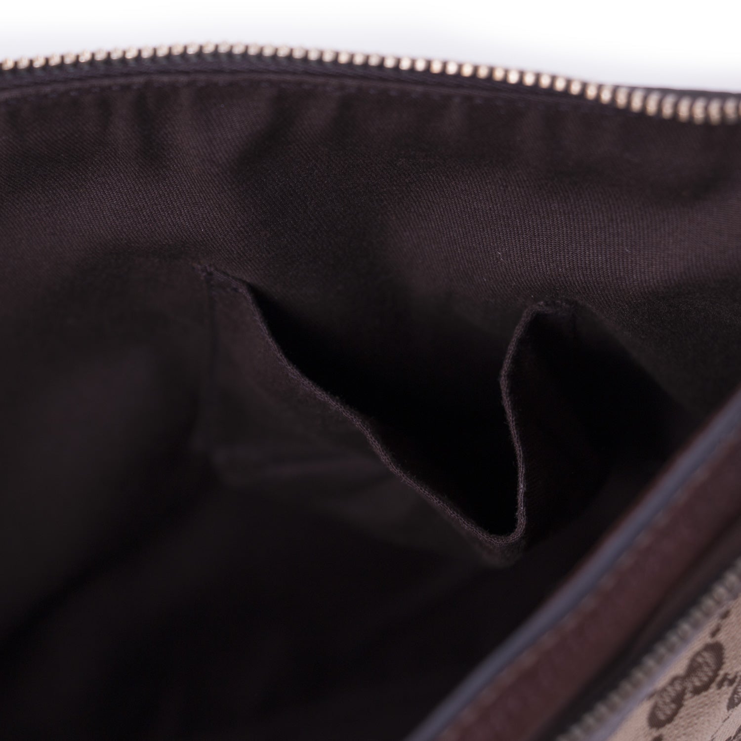 Details: Brown and Tan GG Canvas / Brass Hardware / Single Rolled Handle / Brown Leather Trim / Dual Pocket on Exterior Front / Brown Canvas Interior Lining / Dual Pockets at Inside one with Zipper / Zip Closure at Top