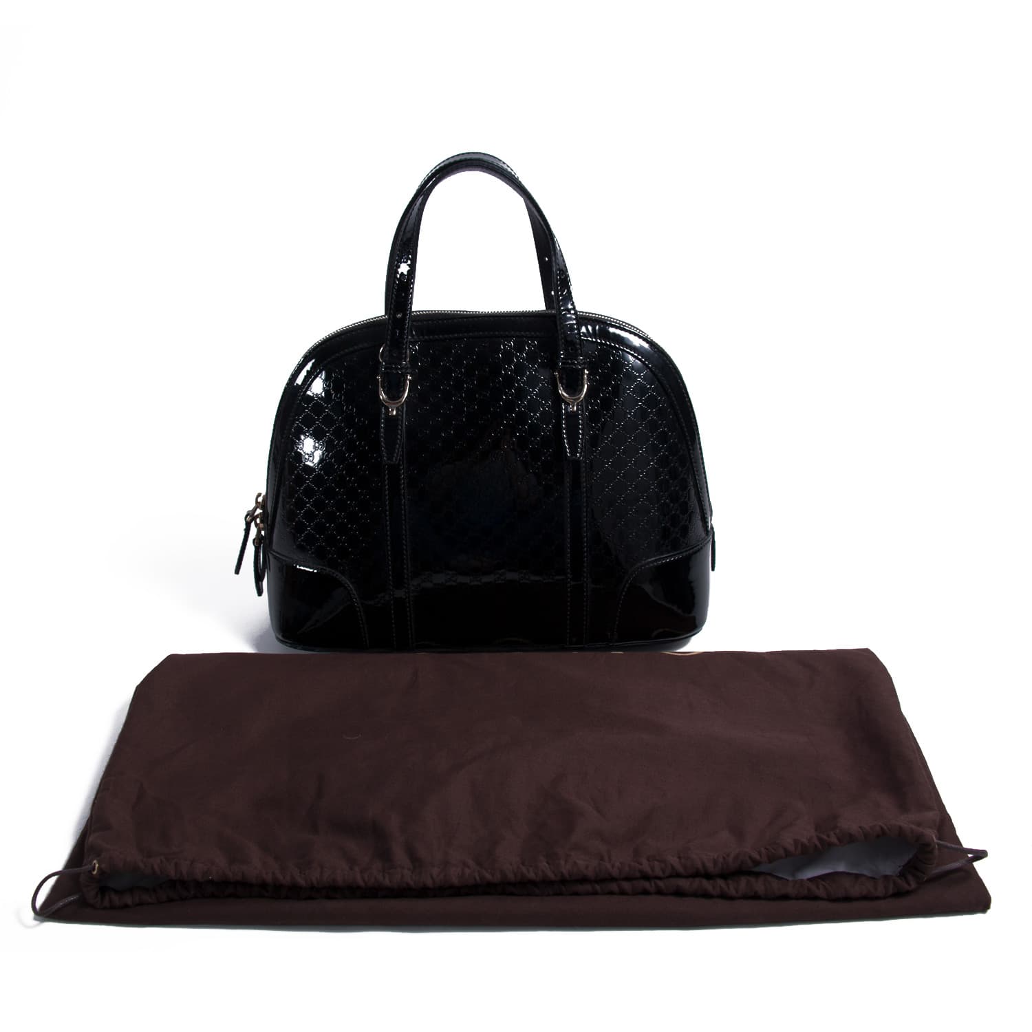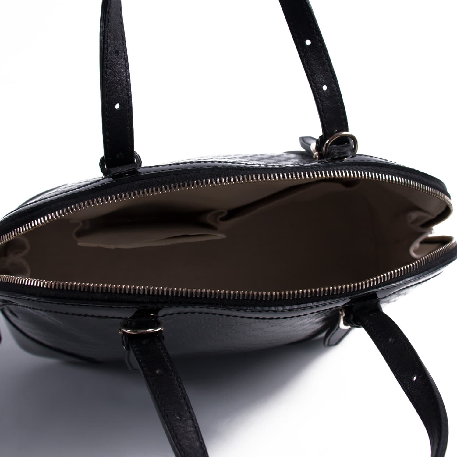 Details: Black Patent Leather / Light Gold-Tone Hardware / Detachable Leather Shoulder Strap / Dual Rolled Handles / Natural Fabric Lining / One Compartment / Three Pockets at Inside / Zipper Closure at Top