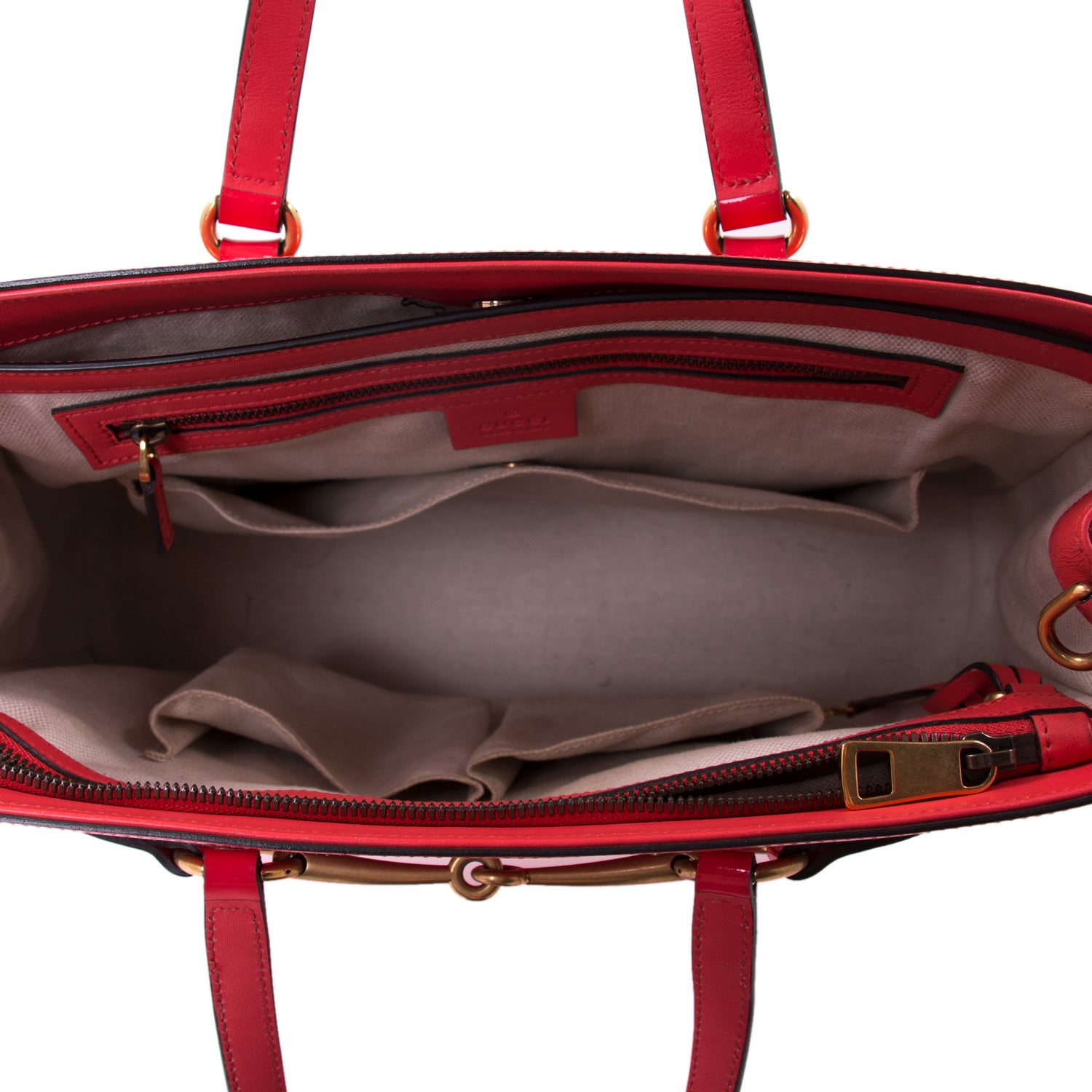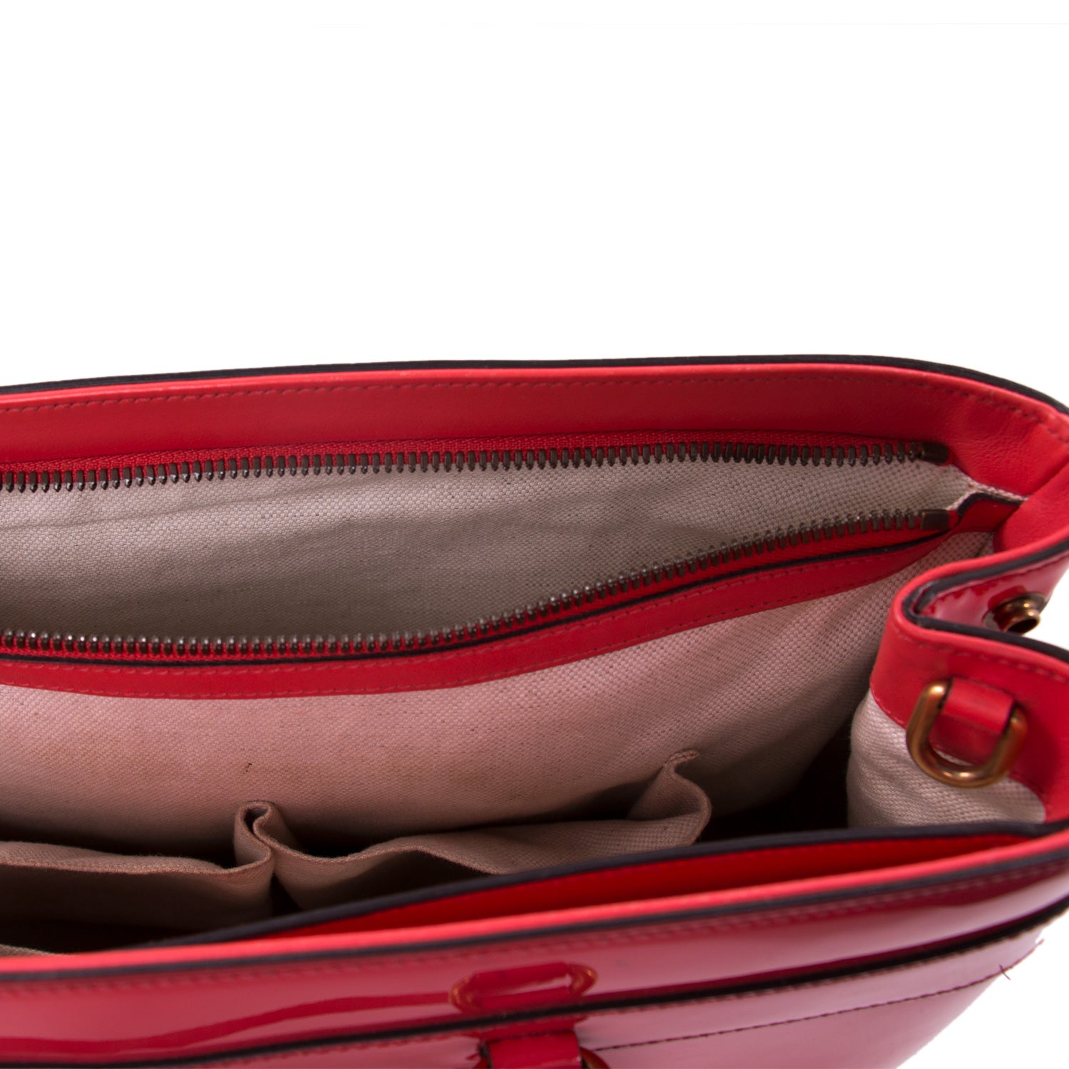 Details: Red Patent Leather / Gold-Tone Hardware / Dual Rolled Handles / Detachable and Adjustable Shoulder Strap / Horsebit Adornment at Front / Beige Canvas Lining / Three Compartments / Four Pockets at Interior, One with Zipper / Open Top