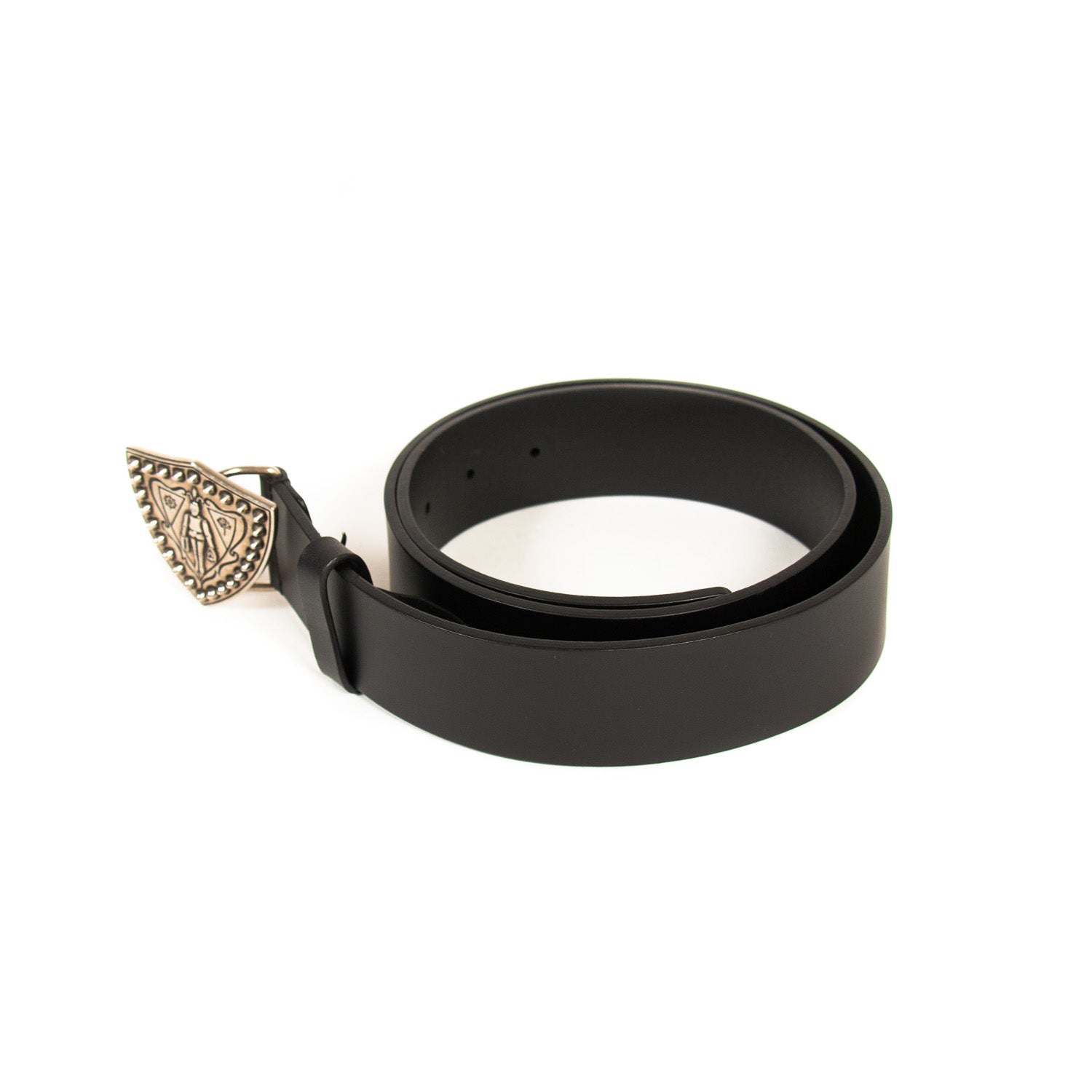 Details: Black Leather / Antique Silver-Tone Hardware / Black Leather Trim / Shield Buckle with Studs at Front