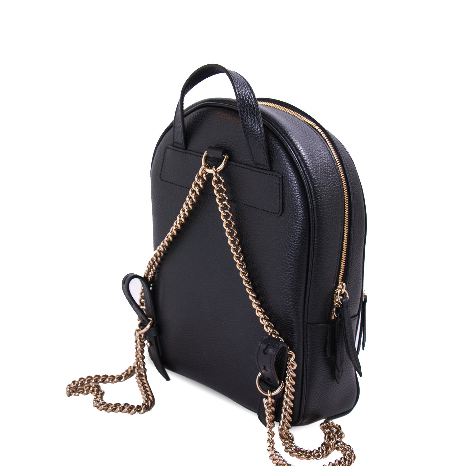 Details: Black Textured-Leather / Gold-Tone Hardware / Embossed Interlocking GG Logo / Leather Top Handle / Dual Chain-Link Straps / Zipper Pocket at Front / Fabric Interior Lining with Open Pockets / Two-Way Zipper Closure