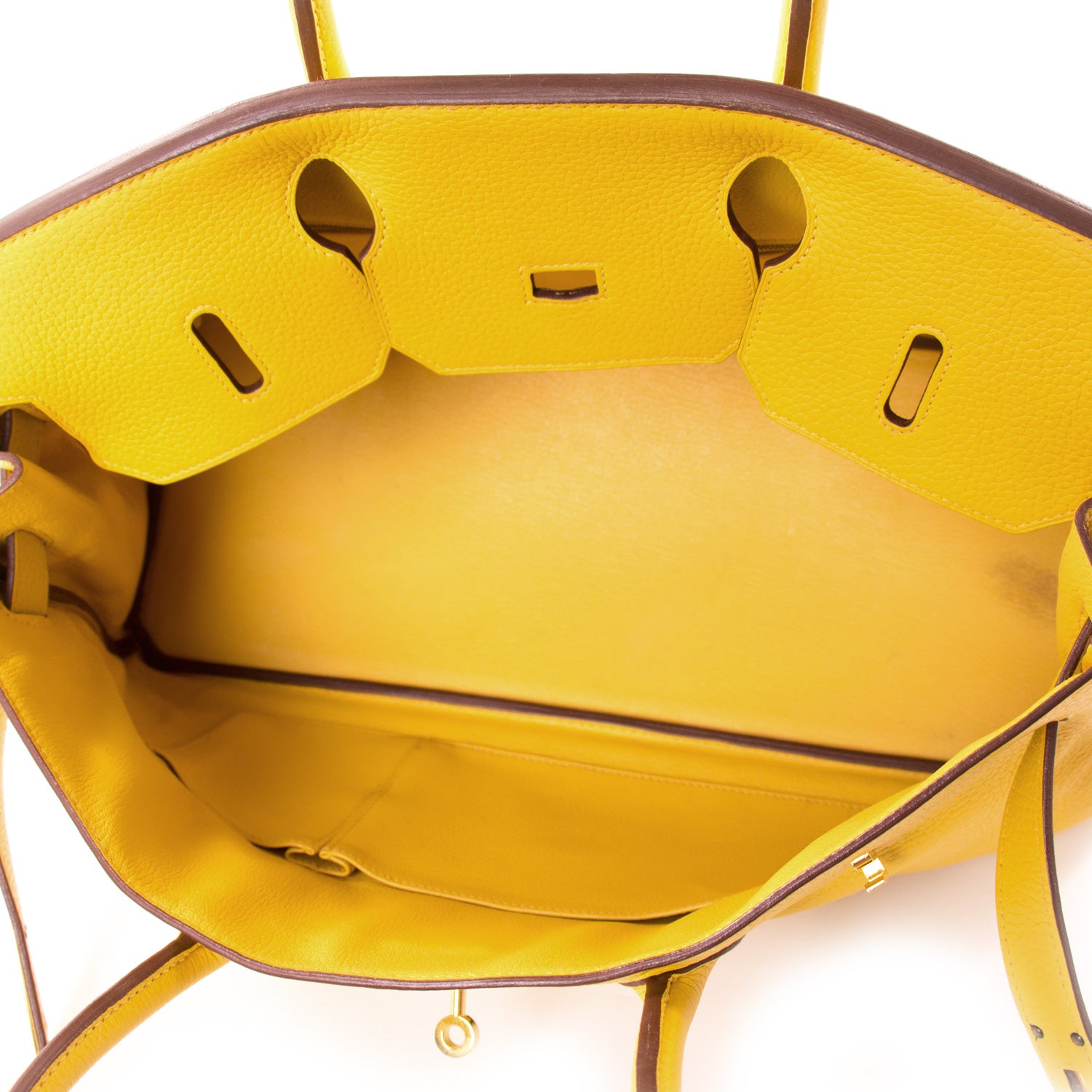 Details: Jaune Clemence Leather / Gold-Tone Hardware / Brown Leather Trim / Dual Rolled Handles / Protective Feet at Base / Leather Lining at Interior / Zipper and Flat Pocket at Inside / Pull-Through Closure at Front Flap with Turn-Lock
