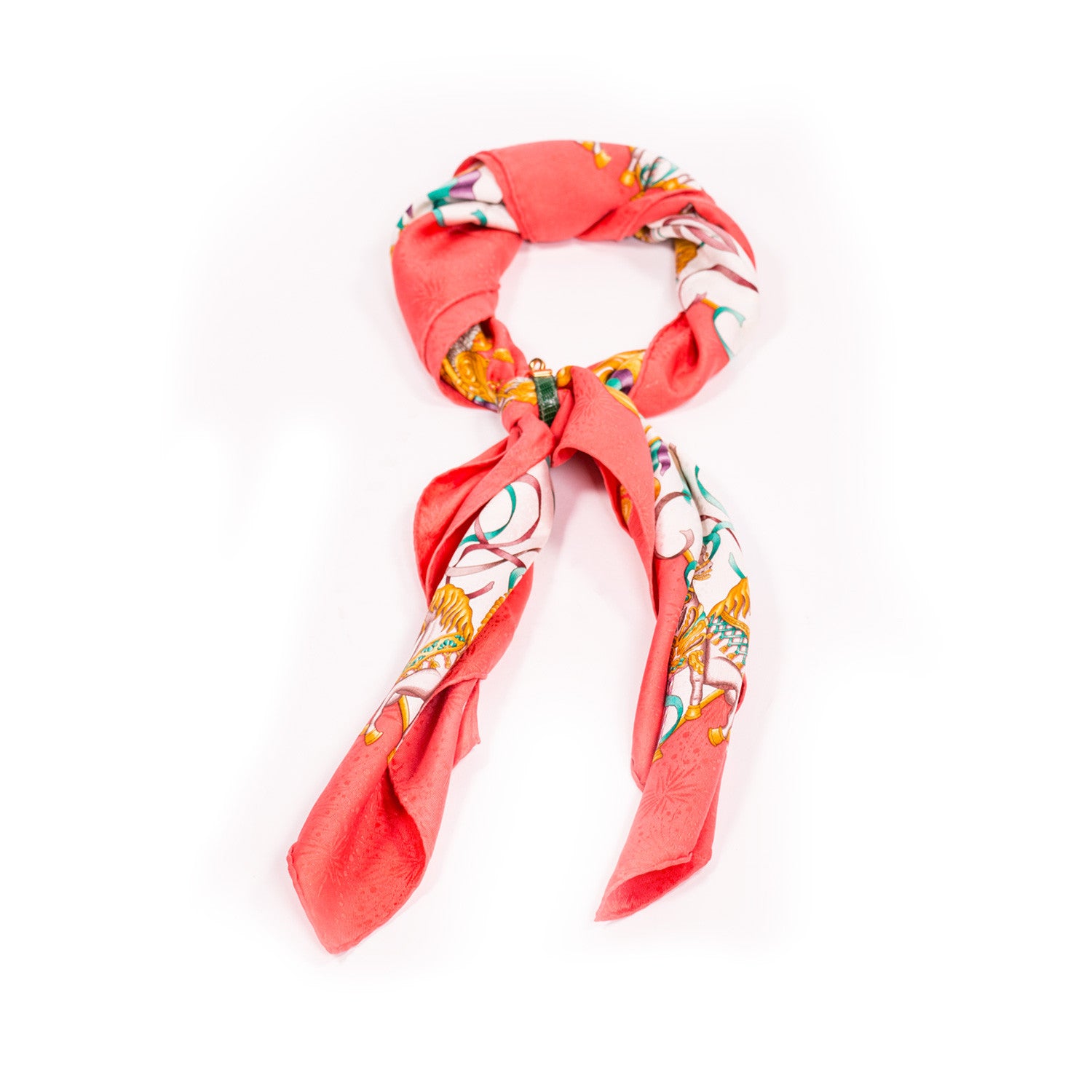 Description: Authentic Hermes Printed Silk Scarf in Red and Multicolor / Printed Horse Theme