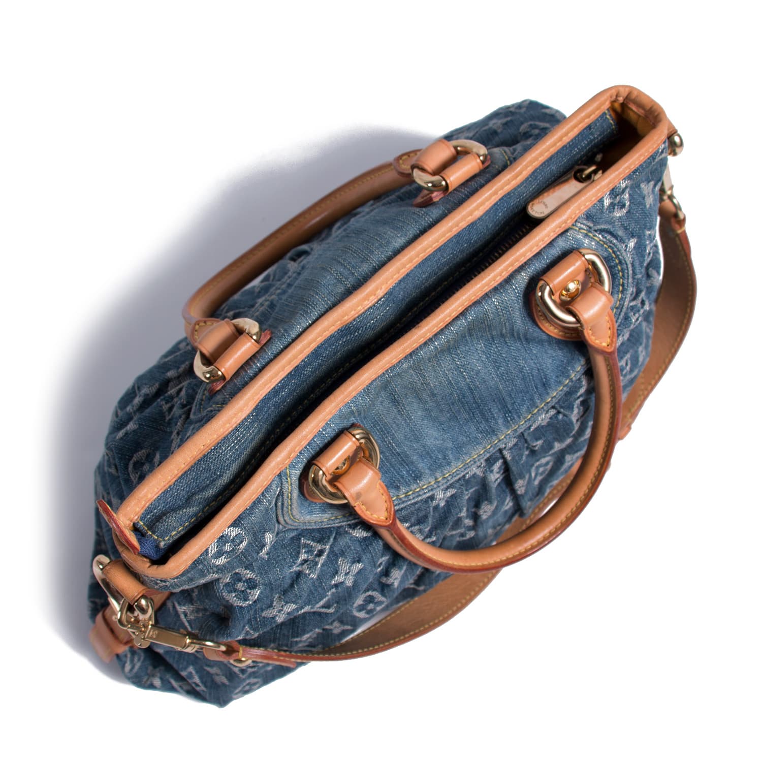 Details: Blue Monogram Denim / Gold-Tone Hardware / Dual Rolled Handles / Detachable Shoulder Strap / Mustard Alcantra Lining / Dual Flat Pockets at Interior Wall / Zip Closure at Top
