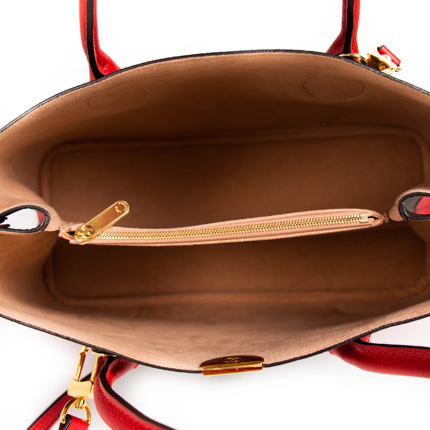 Details: Brown Monogram Coated Canvas / Red Leather Lining / Gold-Tone Hardware / Dual Rolled Handles / Detachable Shoulder Strap / Studs at Base / Alcantara Lining / Three Compartments, One with Zipper / Open Top