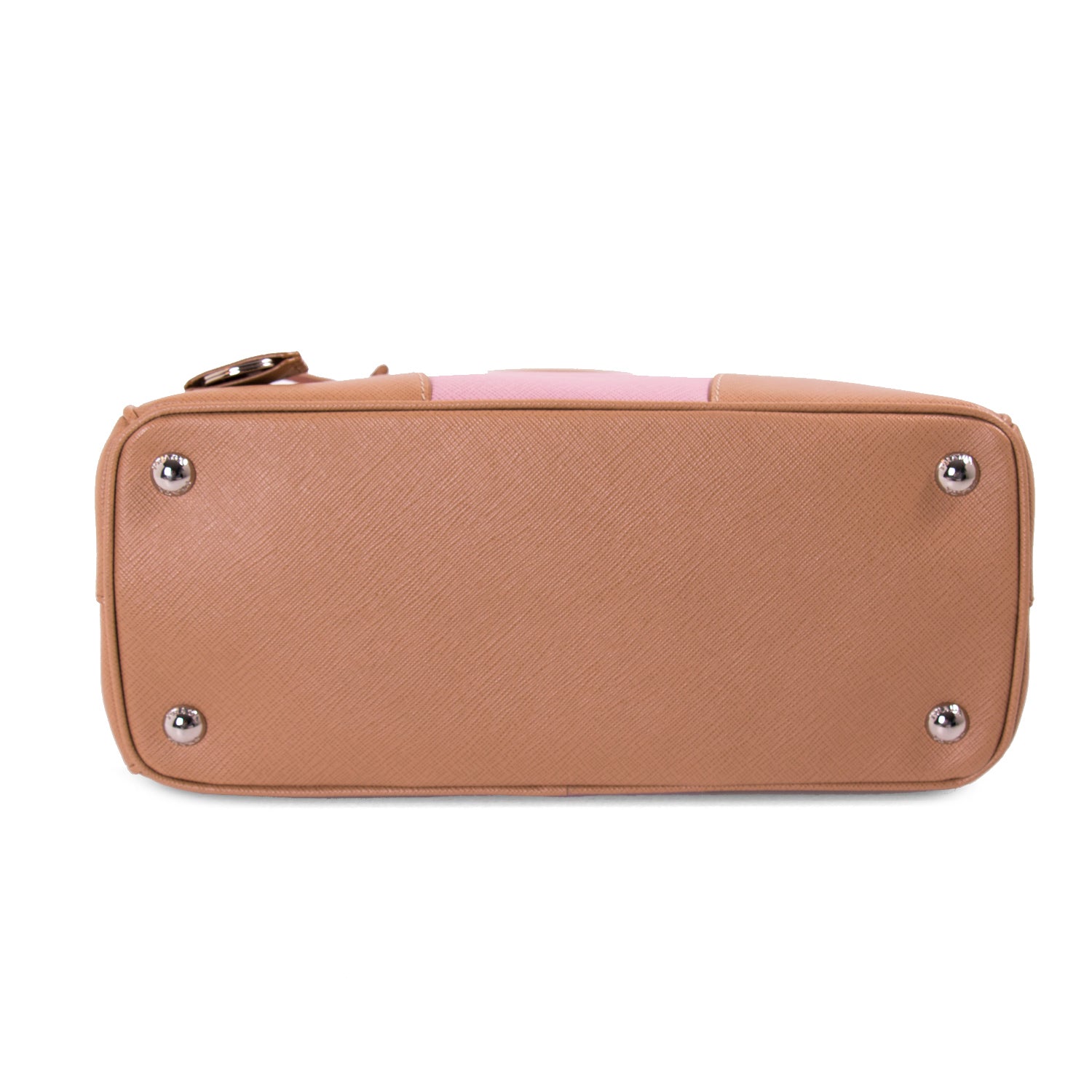 Details: Pesco and Natura (Pink and Tan) Saffiano Leather / Silver-Tone Hardware / Dual Rolled Handles / Detachable Adjustable Shoulder Strap / Pink Interior Lining / Three Compartments, Two with Zipper Closure / Flat and Zipper Closure at Inside