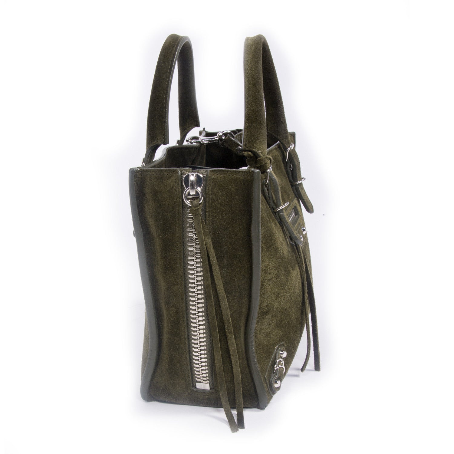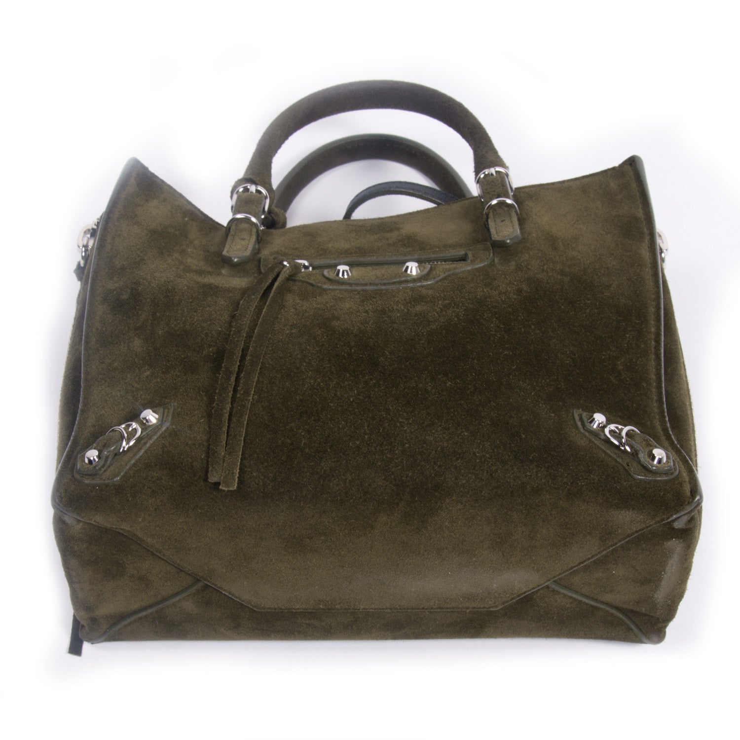 Details: Vert Olive Suede Tote / Silver-Tone Hardware / Adjustable Removable Shoulder Strap / Buckled Dual Rolled Handles / Single Pocket at Exterior With Zip Closure / Stud And Buckle Embellishments at Front / Dual Zip Expansions at Sides / Vert Olive Suede Inside / Black Leather Interior Base / Single Slit Pocket at Interior Wall and Open Top